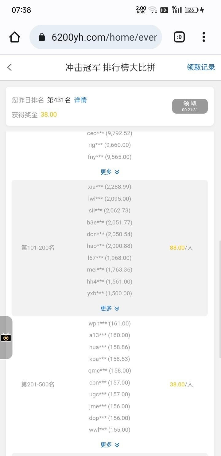咋天有流水可以领彩金,流水不高100多领了俩天38上去看看吧