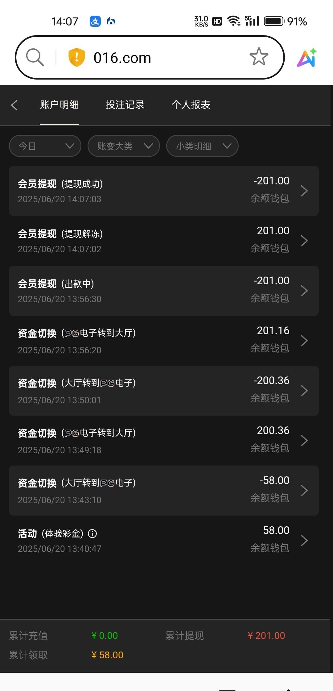 刚刚来了个电话我给挂了,马上又打来一个,我接上刚准备骂,对面是个声音特别好听的妹子,说送我58让我上号领,然后他告诉我链接我就上去了,看了下资料16号注册的,一分钱没充,今天就打过来了,打的pg招财猫,0.8打的,特别大,上去就是免费,不到5分钟打到201流水不够又回去玩了5分钟刷够58流水总共用了十分钟左右直接提了,直接到账