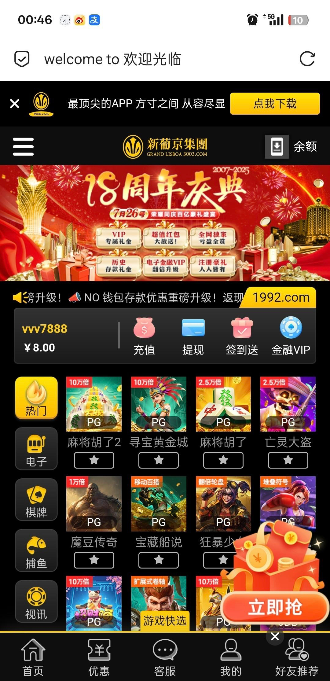 撸过3003新葡京的再去看看,有没有闯关彩金! 我领了8