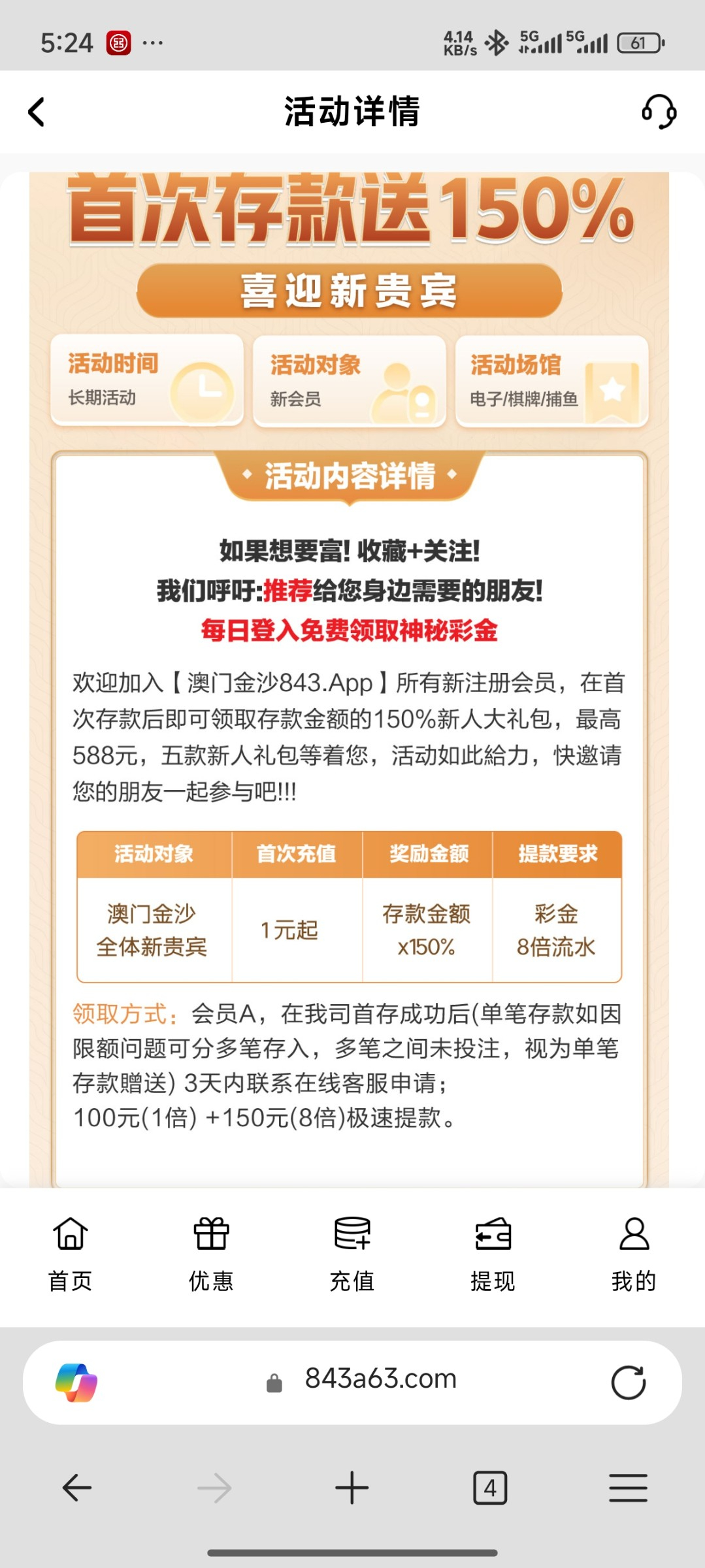 前面老哥发过以小博大40+50+的那个,刚才我仔细看了一下活动首存有一个存款送150%彩金的活动本金一倍彩金八倍,而且还开可以申请三次包赔,第一次申请50%第二次申请充值80%,第三次申请充值100%
