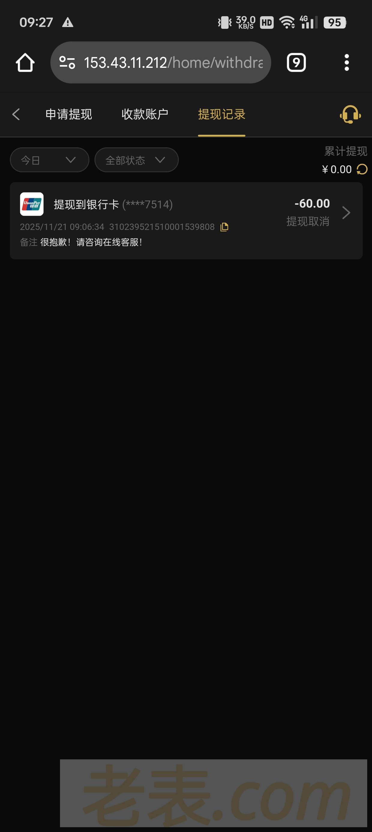 995.com 充值十块钱提60被黑 禁止充值